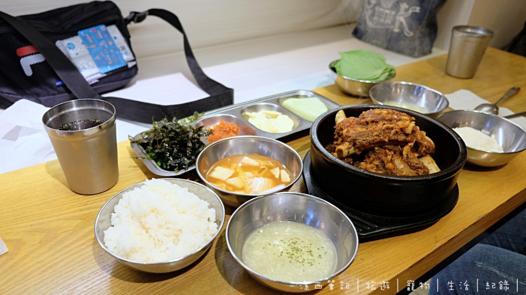 來的時候已經是第一批人進去用餐了,大家其實吃得滿快的,很快就輪到我們進去。點了兩人份的燉排骨,會附上冷泡菜湯及濃湯,旁邊有小菜、白飯、飲料跟水,可以自行取用。